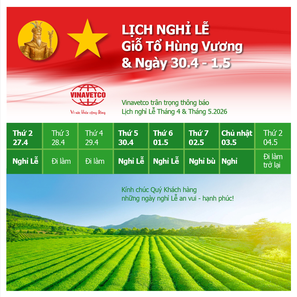 Để thuận tiện cho việc sắp xếp công việc và giao dịch, Vinavetco xin thông báo lịch nghỉ lễ Giỗ tổ và Ngày 30/4; Quốc tế lao động 01/5 như sau: